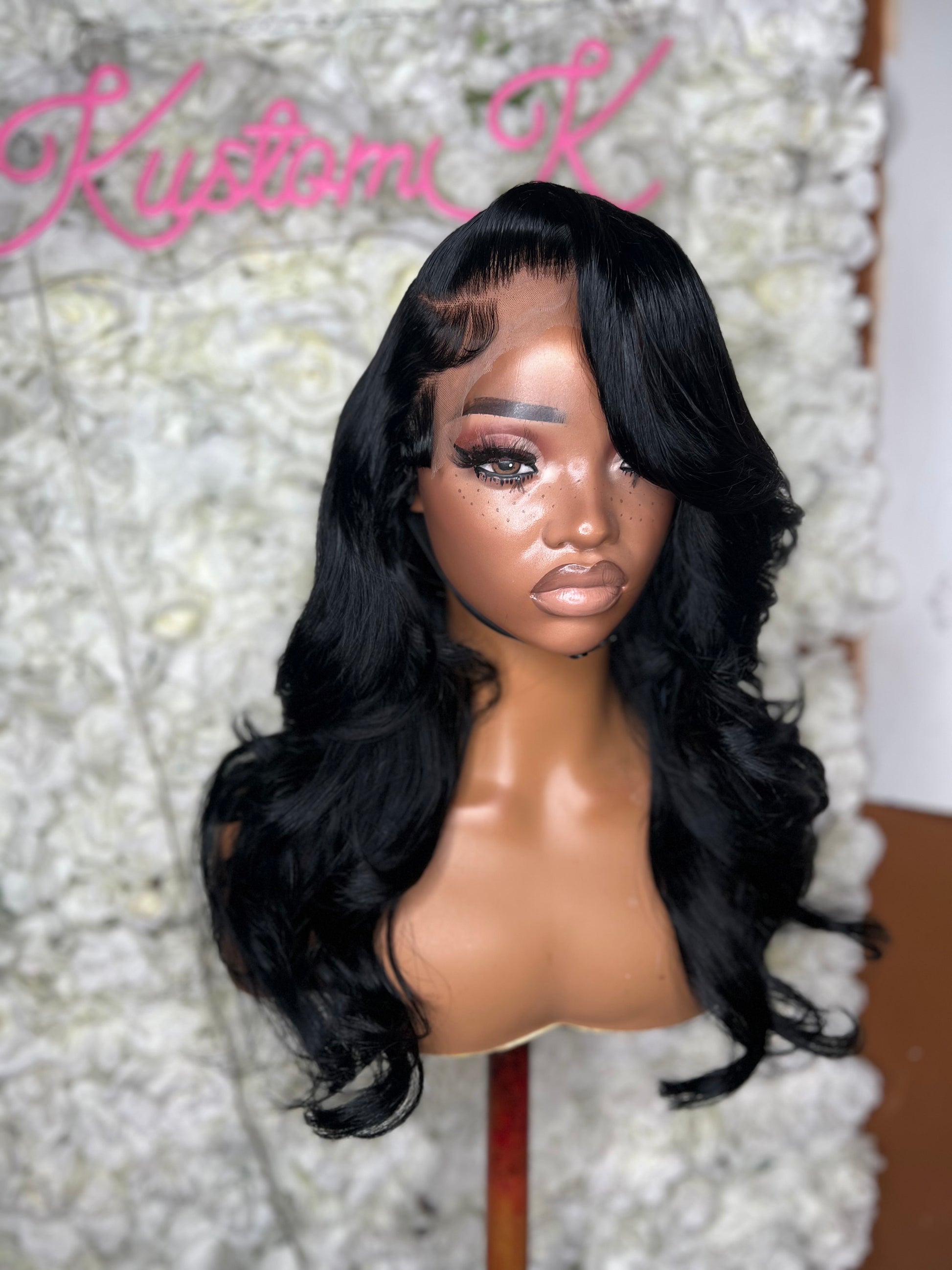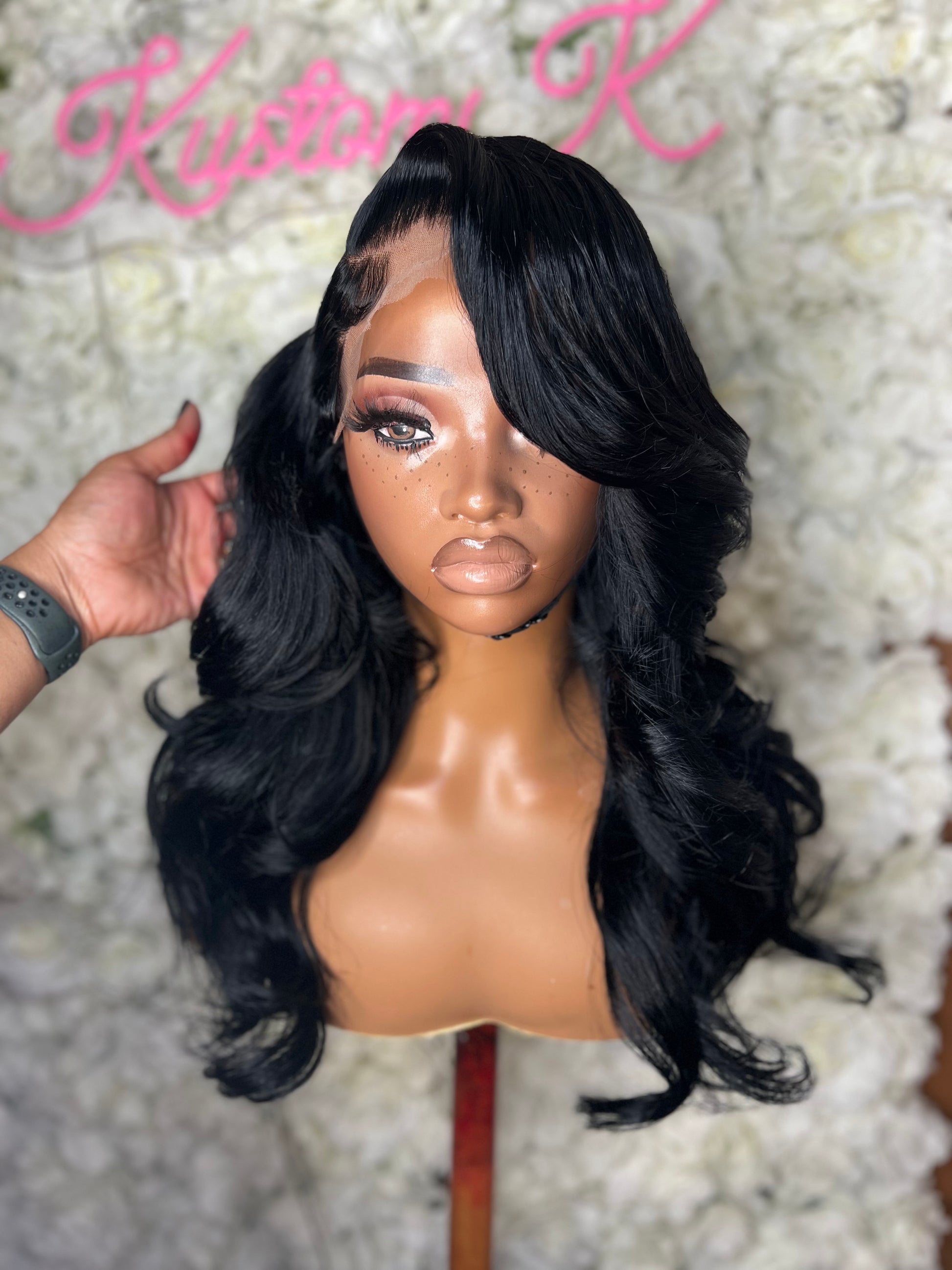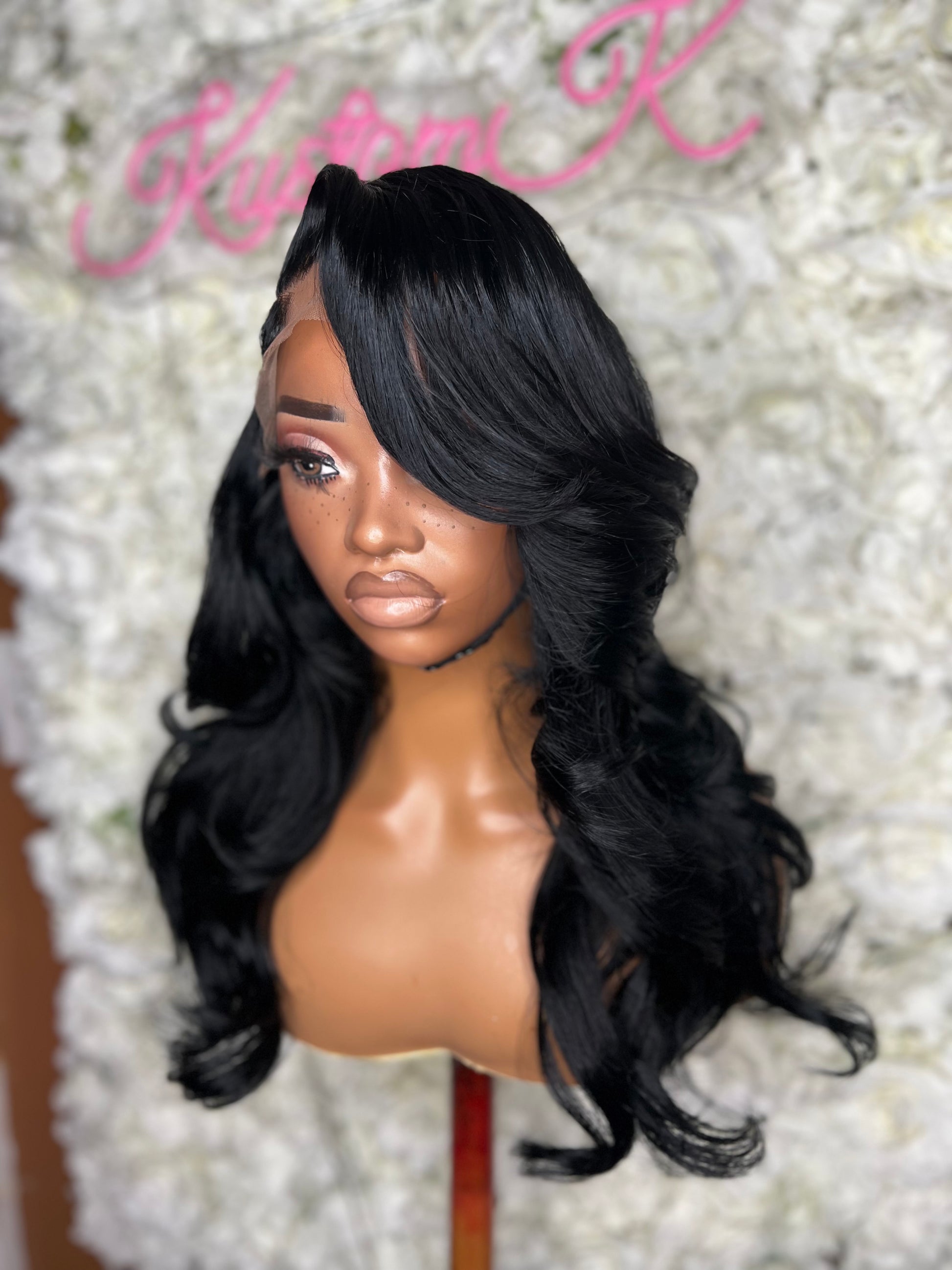 Fully customized with plucked hair line and bleached knots. This unit is styled in a side part with baby hair, layers, and curls. The closure on this unit was sewn 2 inches to the right. Elastic band added to the back for glueless installs.