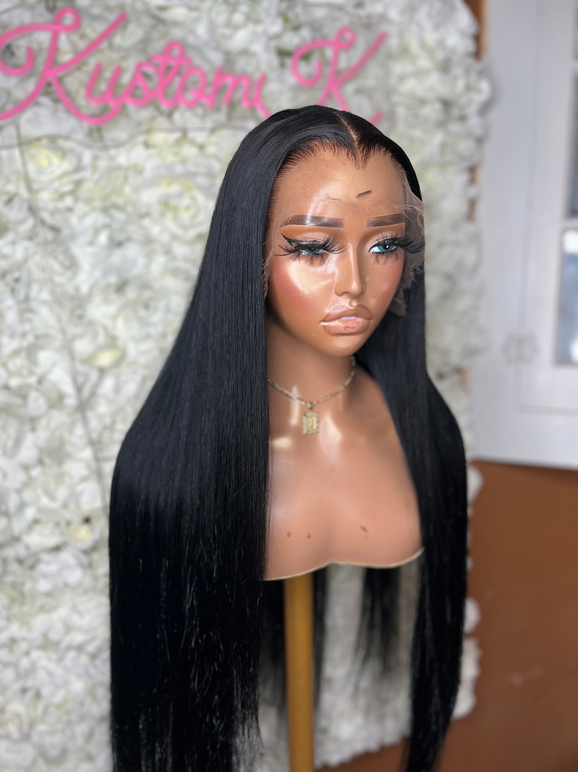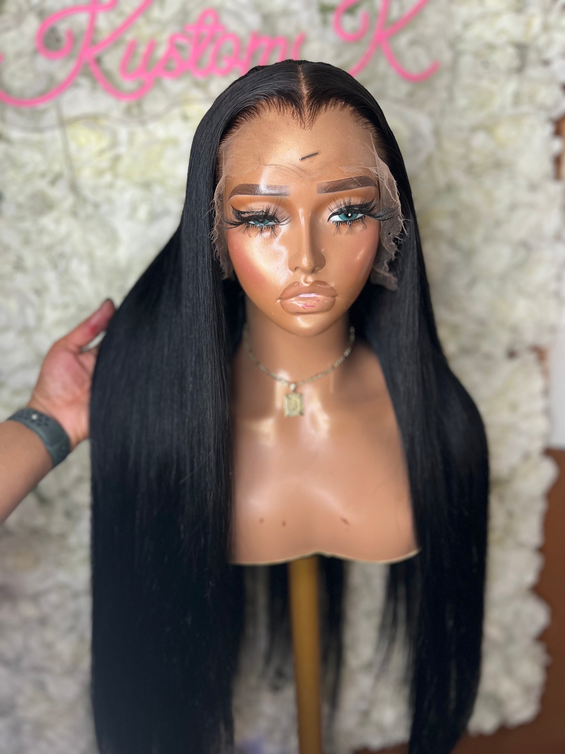 Fully customized with plucked hair line and bleached knots. Aaliyah has been styled in a middle part with a widows peak. Elastic band added to the back for glueless installs.