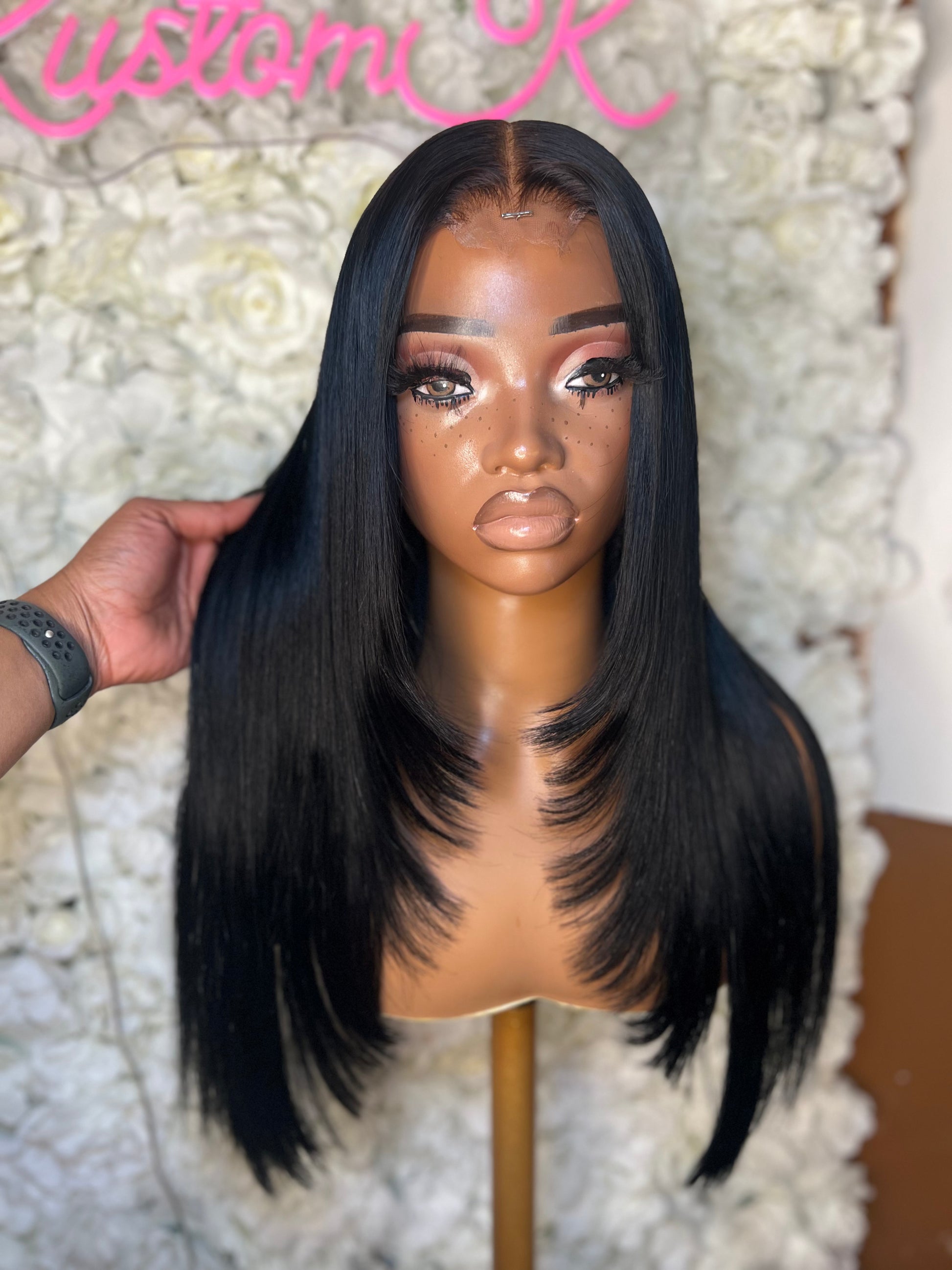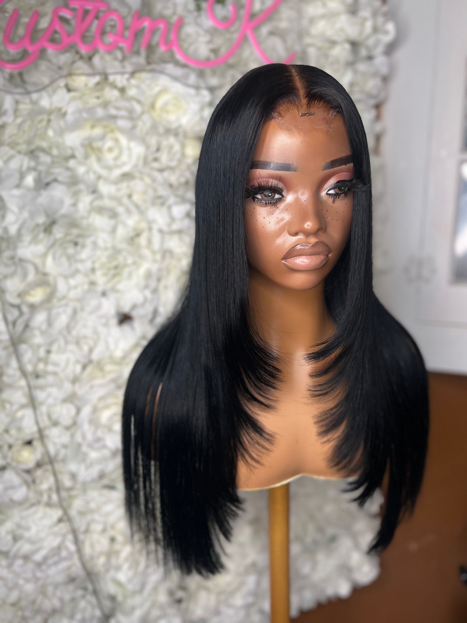Fully customized with bleached knots and plucked hairline. Angela has been styled in a middle part with face framing layers. Elastic band annd drawstring added for glueless installs.