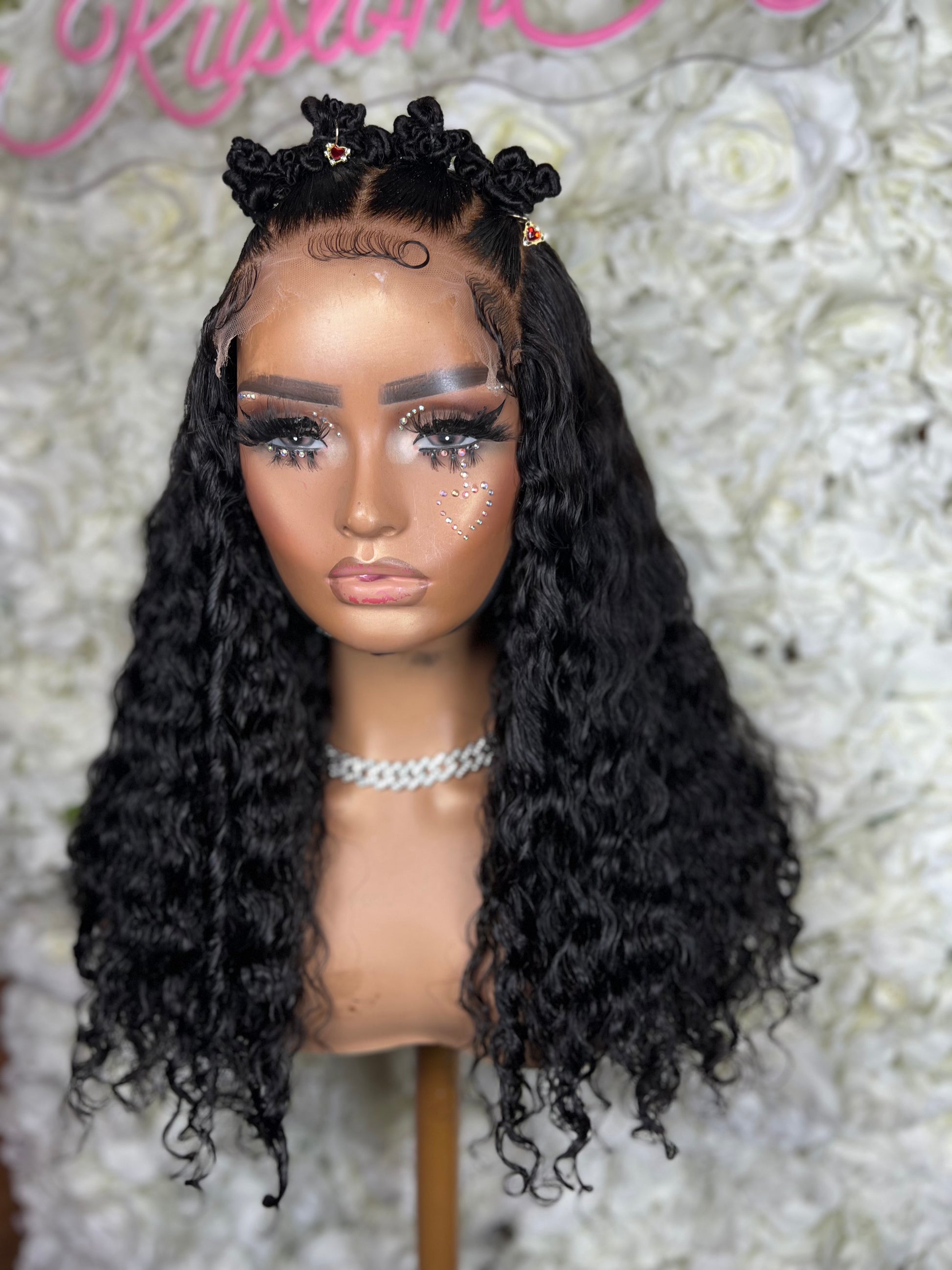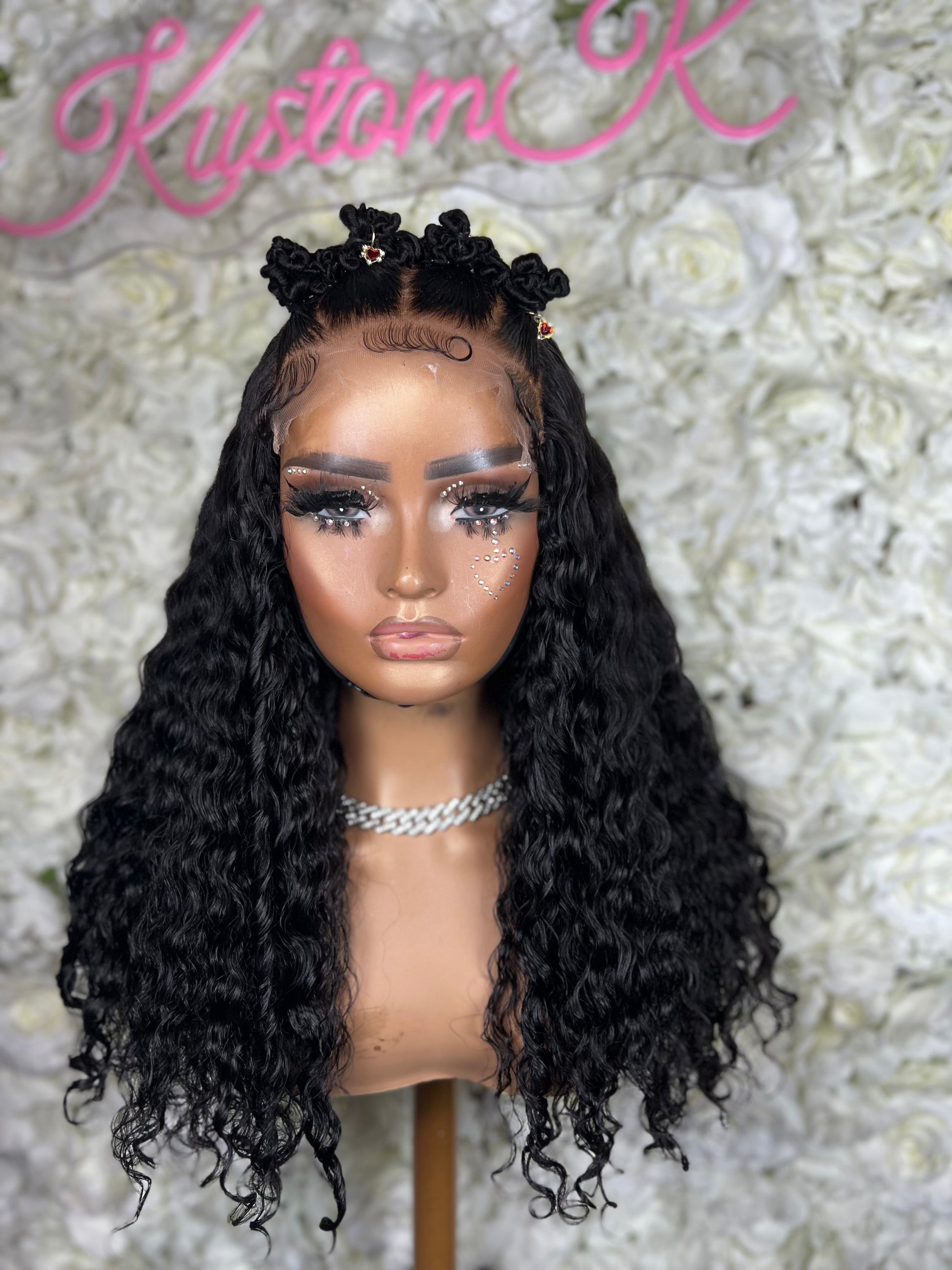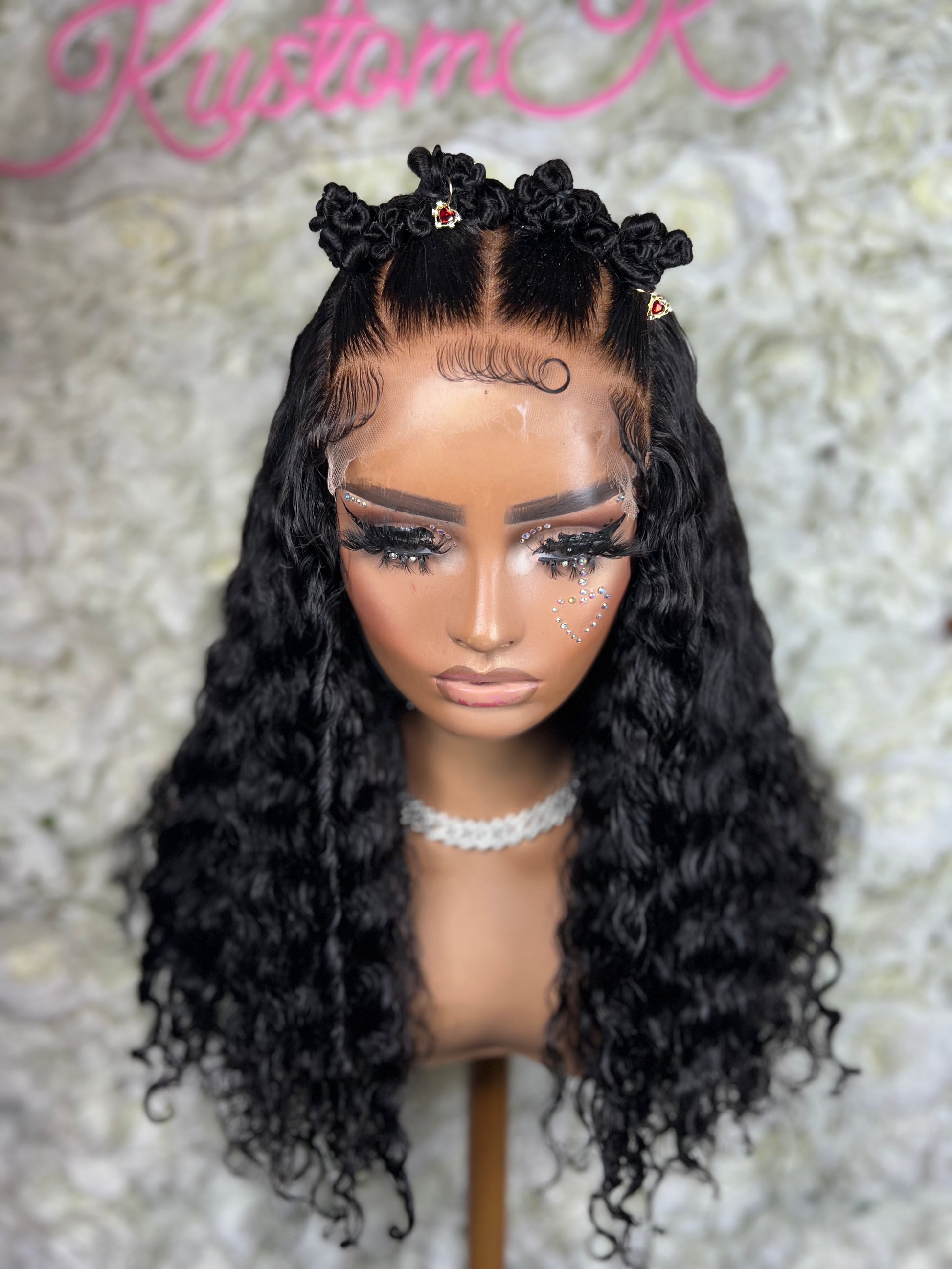 Fully customized with bleached knots and plucked hairline. Kourtney is in a unique style with baby hair. Elastic band added in the back for glueless installs.